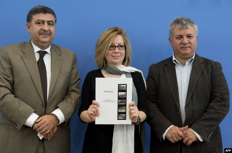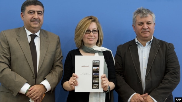 (From L) Members of the opposition Syrian National Council Murhaf Jouejati, Afra Jalabi, and member of the opposition National Change Currents Amr Al-Azm following a press conference in Berlin, August 28, 2012.