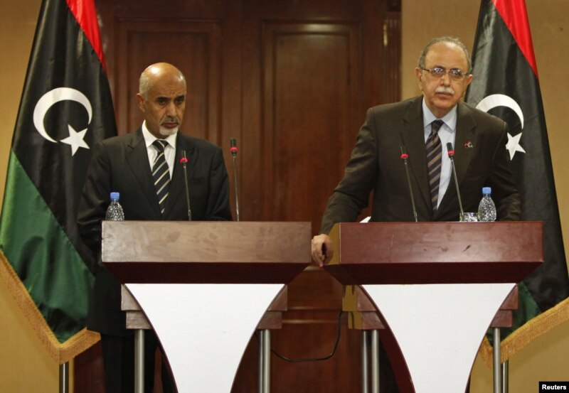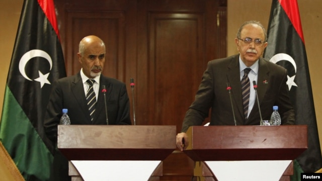 Libya's Prime Minister Abdurrahim El-Keib (R) and Head of the national assembly Mohammed Magarief attend a news conference in Tripoli, September 12, 2012.