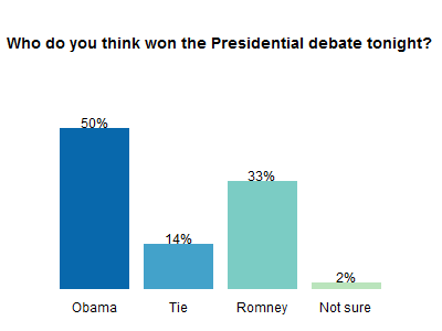 In a YouGov poll of 716 Americans (results) completed in the hour after the 2012 Presidential debates, Obama comes out as the clear victor with 50% of Americans viewing him as the winner. Democrats give Obama the win almost universally (97%) with Independents evenly divided and Republicans leaning toward Romney at a healthy 73%.