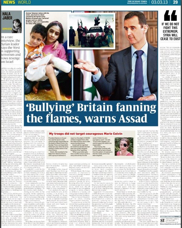 #Syria." http://j.mp/15Wxty9Retweeted 234 timesExpand - Assad says Britain bullying Syria -- major win for the Sunday Times to get this interview http://www.bbc.co.uk/news/world-middle-east-21646091 …