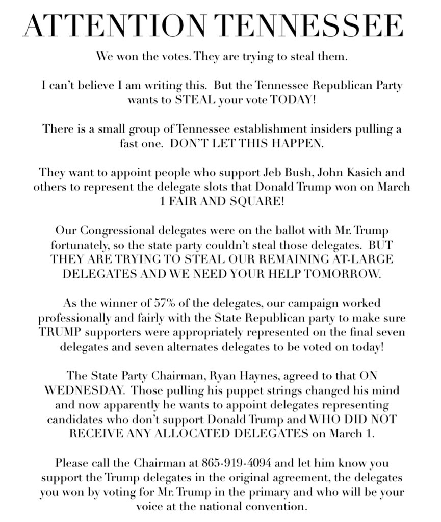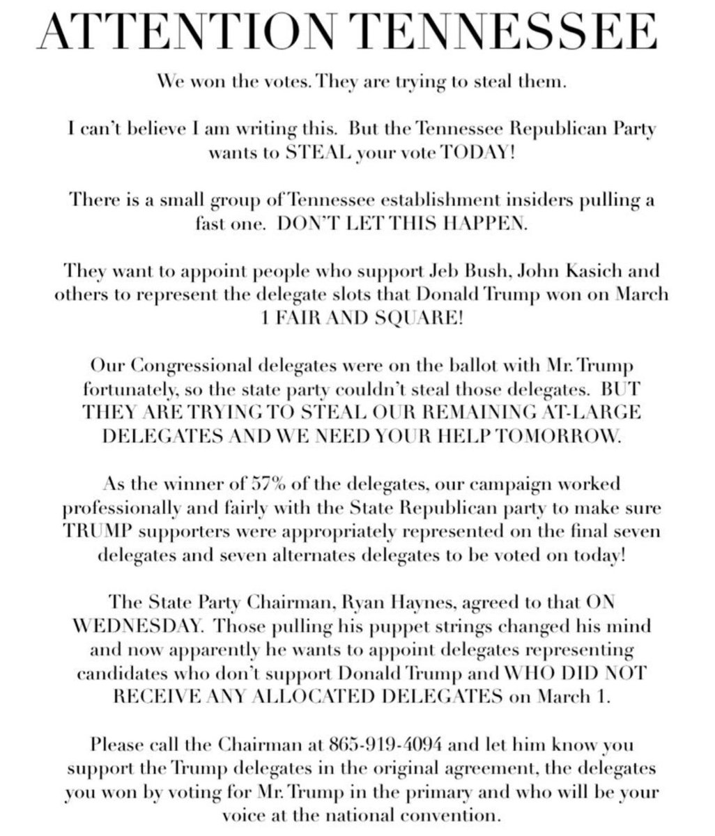- Trump Campaign: Tennessee GOP trying to steal Delegates from Trump Just like Louisiana http://hill.cm/dd4DQG8