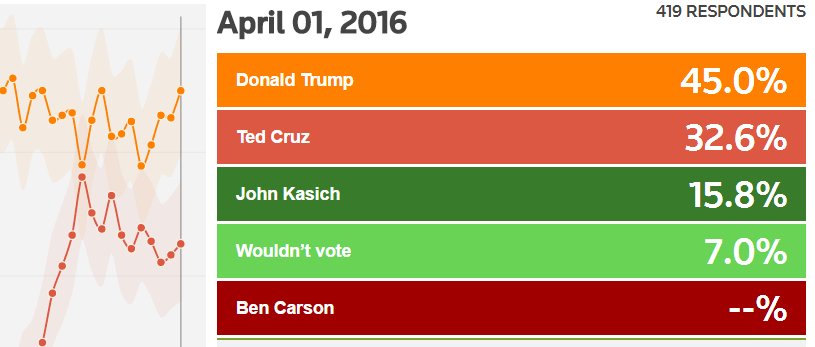 - FEMALE #Republican GOP voters (Apr1) #Trump 45.0% #Cruz 32.6% #Kasich 15.8% #Sanders #Clinton #TrumpTrain #CruzCrew0 retweets1 like