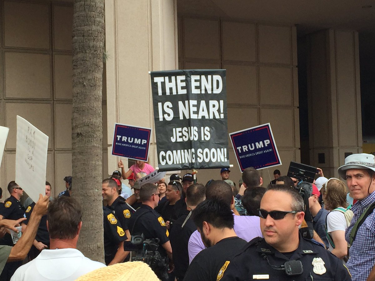 And the winner for biggest sign in #Tampa among the crowd of #Trump protestors vs. supporters goes to:THE END IS NEAR