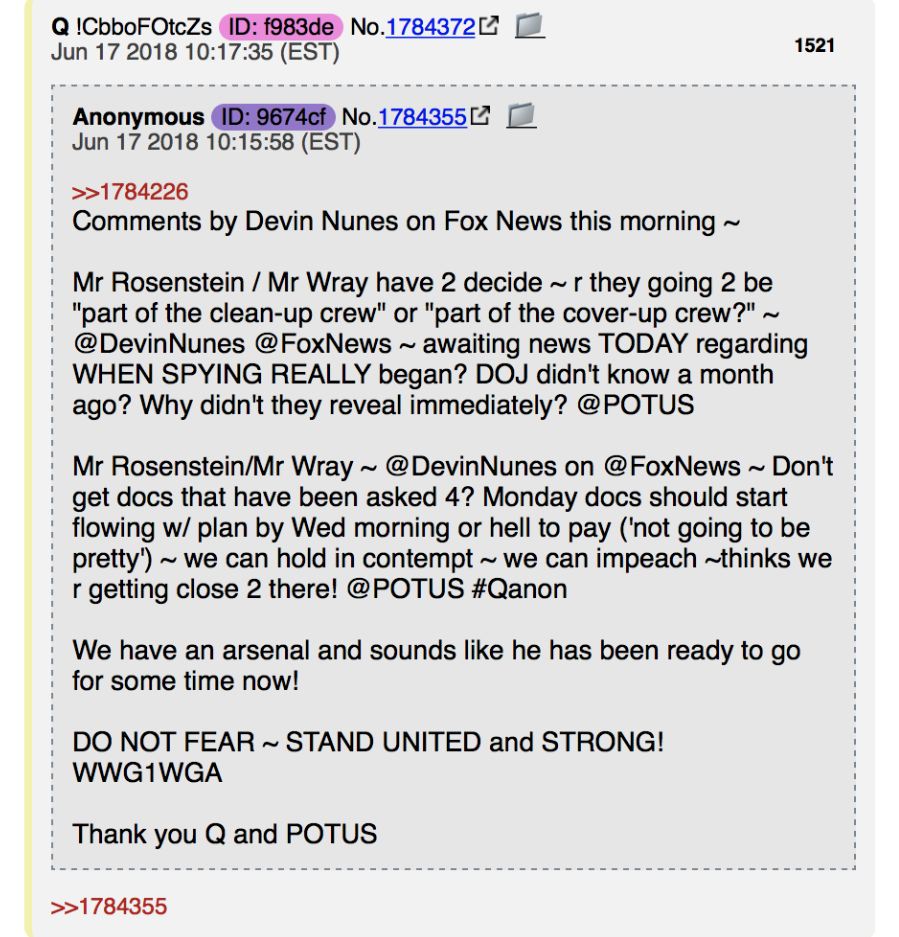 - 1. #QAnon threads his June 12 post foretelling Ryan role in full weight of the house. Now, Ryan states “there’s going to be action on the floor of the House this week if FBI and DOJ do not comply with our subpoena request.” http://www.foxnews.com/politics/2018/06/17/gop-will-hit-fbi-doj-with-full-arsenal-constitutional-weapons-if-dont-comply-with-subpoena-gowdy-warns.html … "coincidences? Have faith. #Q"4 replies23 retweets34 likes