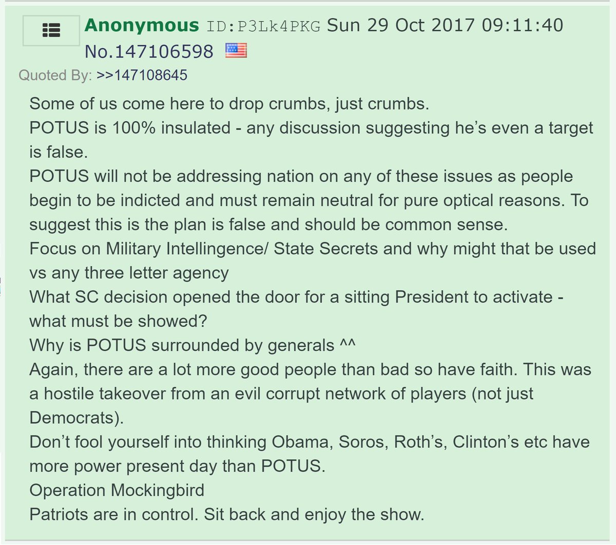 - 41) More to the current point of discussion, #Qanon suggested on October 31st, that Military Intelligence would be used to help prosecute the swamp because they could not trust corrupt investigators (FBI), prosecutors (DOJ), and judges.