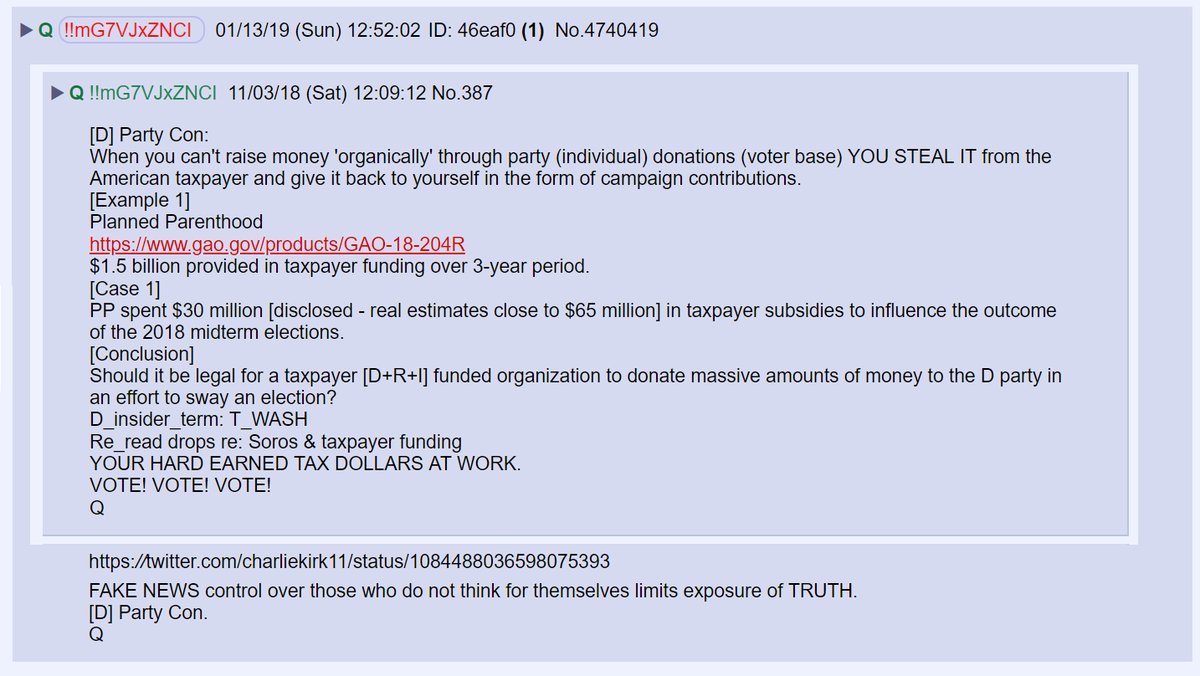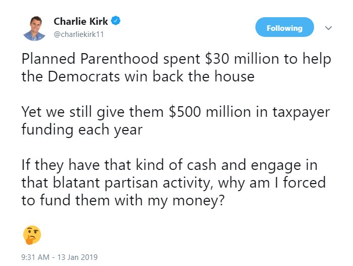 - 13) Charlie Kirk noted that Dems have developed a way to get taxpayers to fund their campaigns: They vote for taxpayers to fund organizations like Planned Parenthood and those organizations donate taxpayer money to their campaigns. https://twitter.com/charliekirk11/status/1084488036598075393 …