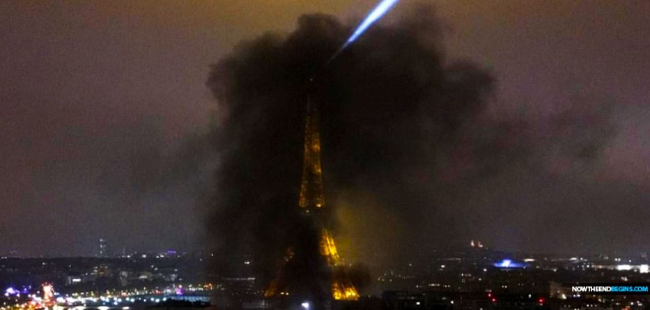 The Eiffel Tower shrouded in thick black smoke, after riot police fired tear gas at crowds earlier today. Citizens seem more determined than ever to overthrow globalism as they demand the removal of Macron.
