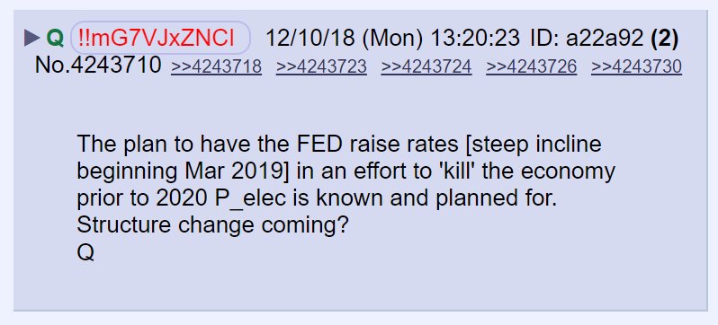 - 81) Q said POTUS is aware of the Fed's plans to increase interest rates throughout 2019 in an attempt to stall the economy, thereby preventing Trump from being reelected in 2020. Q indicated Trump has plans to restructure the Fed.16 replies169 retweets413 likes