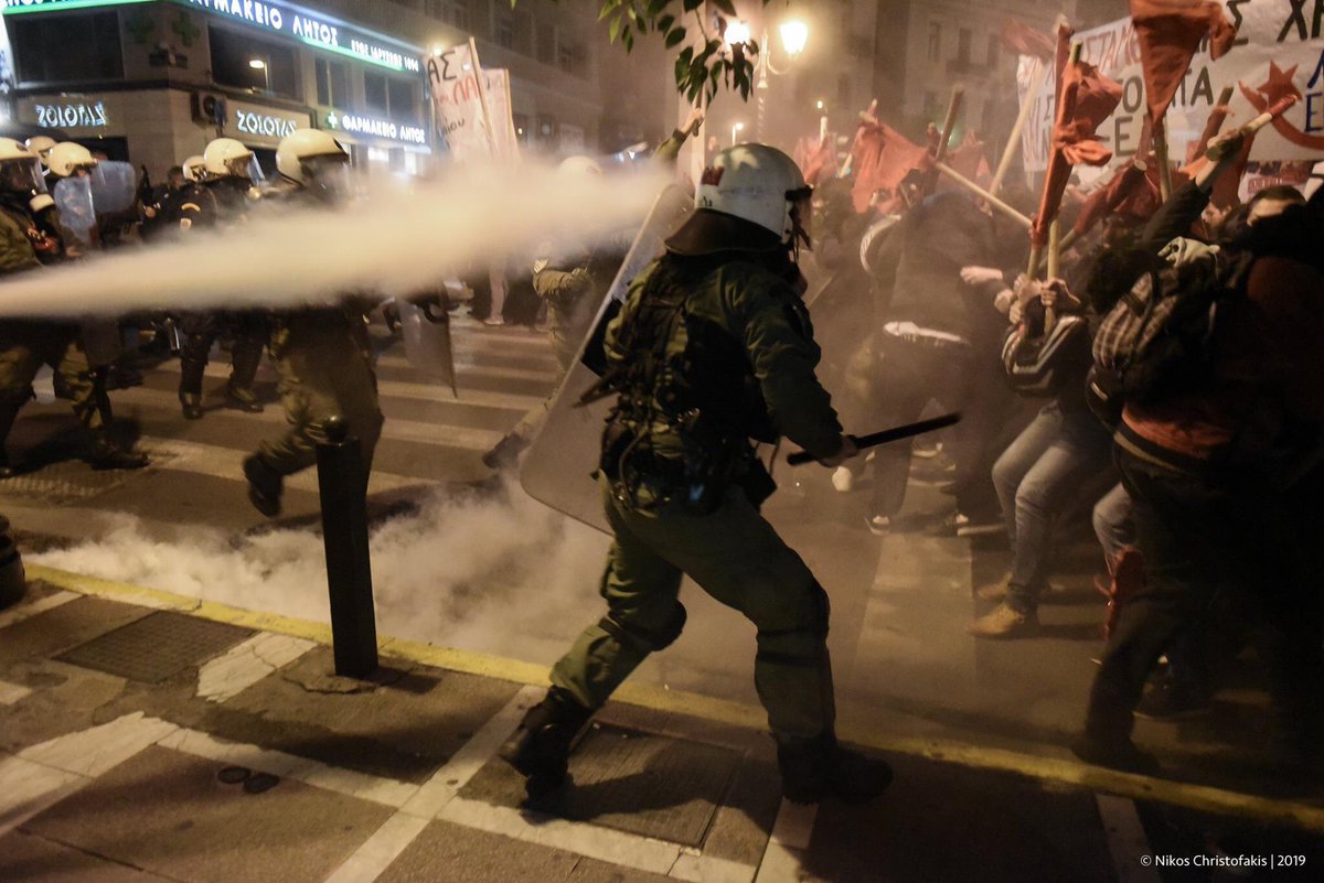 PROTESTS IN GERMANY - Clashes between protestors and riot police during a protest march against the visit of the Chancellor of the Federal Republic of Germany, Angela Merkel