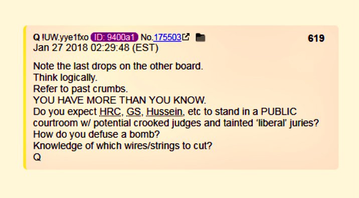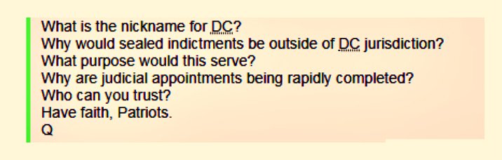 - (13) Here we have the clear hint that some of the prosecutions will be held in military tribunals, rather than civilian courts. #QAnon #TheStorm #GreatAwakening #AskTheQ @POTUS