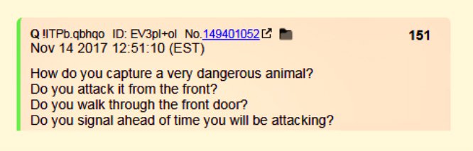 - (8) Already in November, Q started to inform us of the characteristics of the operation. It would not be a frontal, open attack, but rather a "trap". #QAnon #TheStorm #GreatAwakening #AskTheQ @POTUS