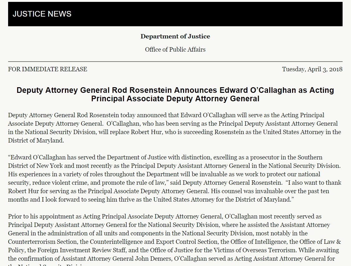 - 35) DOJ announcement of the appointment of EdO'Callaghan as Acting Principal Associate Deputy Attorney General. https://www.justice.gov/opa/pr/deputy-attorney-general-rod-rosenstein-announces-edward-o-callaghan-acting-principal …